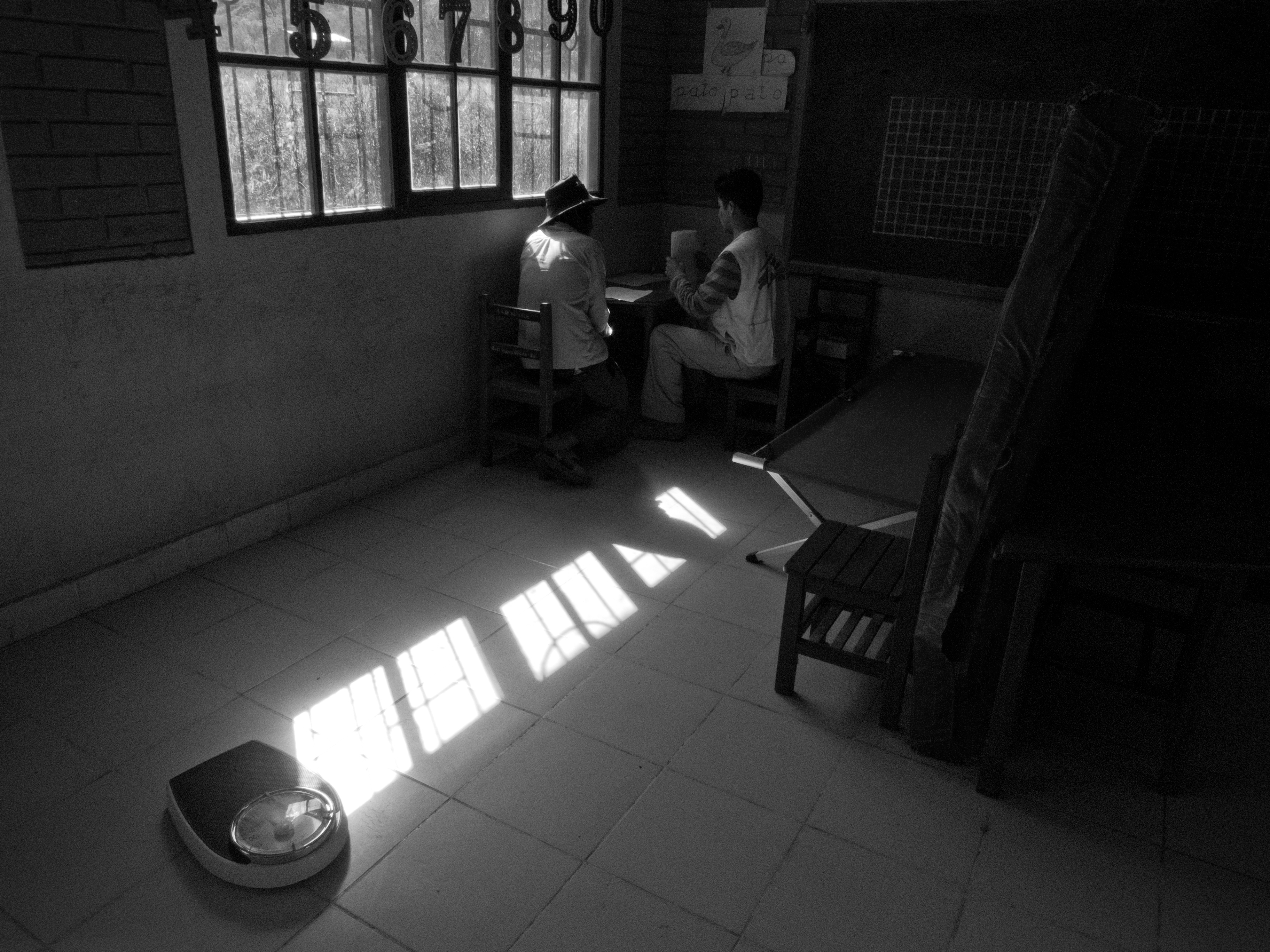 - Médico manuseia papéis sobre carteira escolar. À esquerda, um homem de chapéu o observa. Ambos estão sentados em uma sala de atendimento improvisada em sala de aula. Em primeiro plano, sob os raios de sol que entram pela janela, uma balança no chão. Combate à doença de Chagas em Aiquile, cidade no Departamento de Cochabamba, Bolívia. Registro realizado para Iniciativa Medicamentos para Doenças Negligenciadas (DNDI - Drugs for Neglected Diseases Initiative), em 2011, em parceria com a organização internacional Médicos Sem Fronteiras sobre a incidência na Bolívia da doença de Chagas, doença tropical potencialmente fatal causada pelo parasita (protozoário) Trypanosoma cruzi. Documentação feita com o fotógrafo e cinegrafista André François.